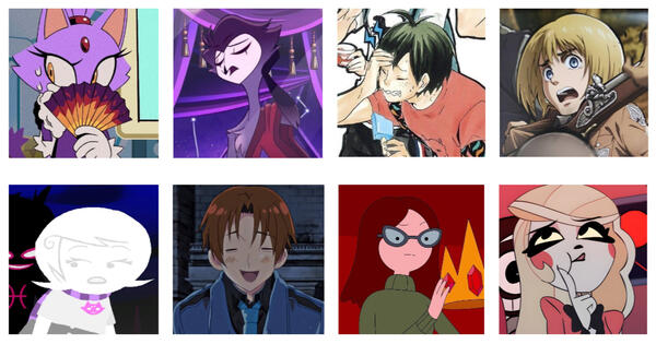 ▪ The promised Neverland, Haikyuu, Attack on titan, Helluva Boss, Homestuck, The smiths, Twice, Red Velvet, Persona 5, Tally hall..